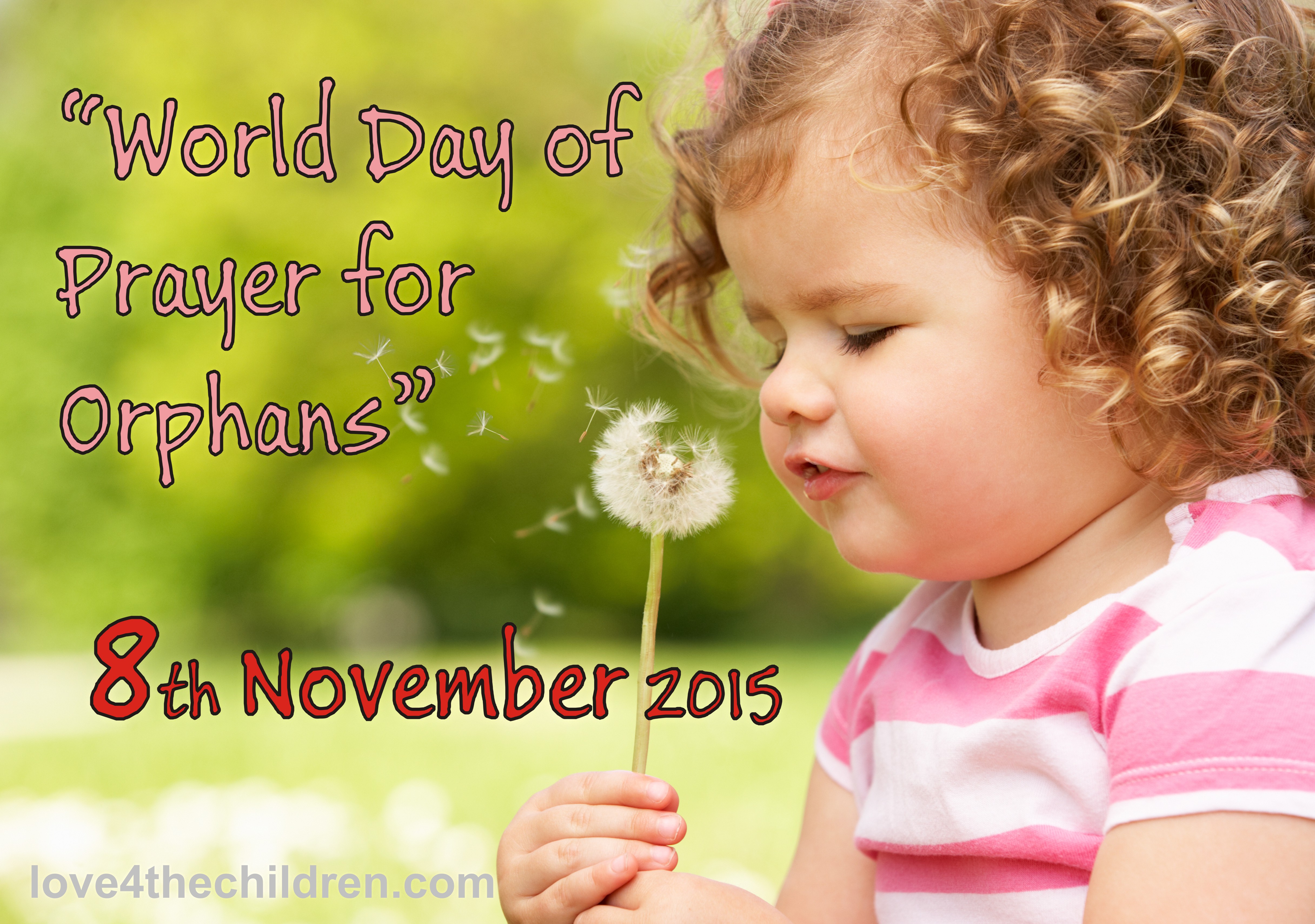 “November 8 is the World Day of Prayer for Orphans. If you care about the futures of orphans, you can make a difference! You may not only pray for orphans during the day, but also visit them in orphanages, run charity campaigns at you local church or organization. Besides that, during your church service you may devote sermons, songs, poems etc. to this issue.”